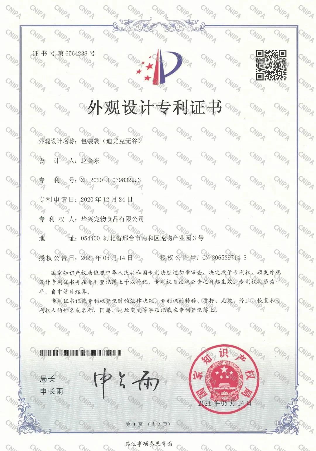 近日,國家知識產(chǎn)權(quán)局依照中華人民共和國專利法經(jīng)過初步審查,授予迪尤克無谷包裝袋外觀設(shè)計專利證書,專利號:ZL 2020 3 0798329.3,并在專利登記薄予以登記。