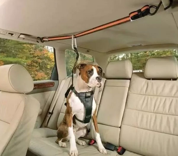 9. 車載妙招  狗狗總愛從后座竄到前面咋辦?  看圖!將繩子固定在車后座的安全扶手上,再用卡扣固定住狗狗,既不影響狗狗在后座活動,又能防止它竄到前面去。
